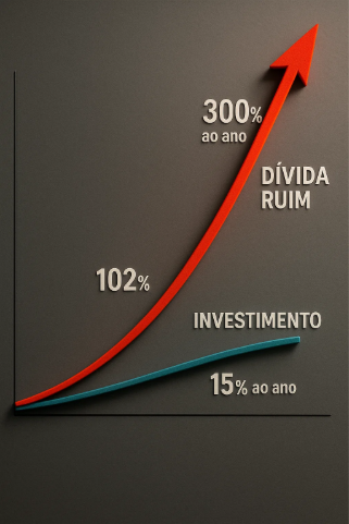 Enquanto você tenta investir e ganhar 10% ao ano, o cartão de crédito cobra até 102% ao ano, e o cheque especial chega a 300% ao ano. Isso é colocar os juros compostos para trabalharem contra você.